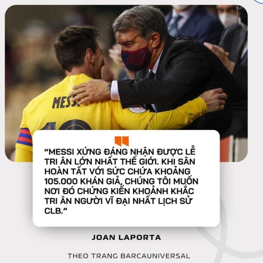 Laporta nhấn mạnh: “Chúng tôi nợ Messi một lễ tri ân xứng đáng. Khi Camp Nou mới mở cửa, đó sẽ là dịp để cả thế giới thấy rằng, Messi và Barcelona là hai phần không thể tách rời.”
